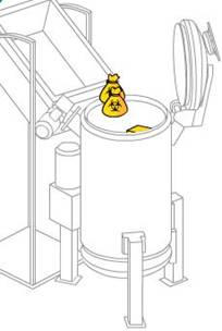 Les bacs roulants sont engagés dans l’élévateur, ils montent en haut de la machine et sont ensuite basculés, les DASRI tombent dans l’ouverture supérieure de la machine. On traite 3 bacs à la suite. Après avoir été vidés, les bacs roulants sont systématiquement lavés et désinfectés.